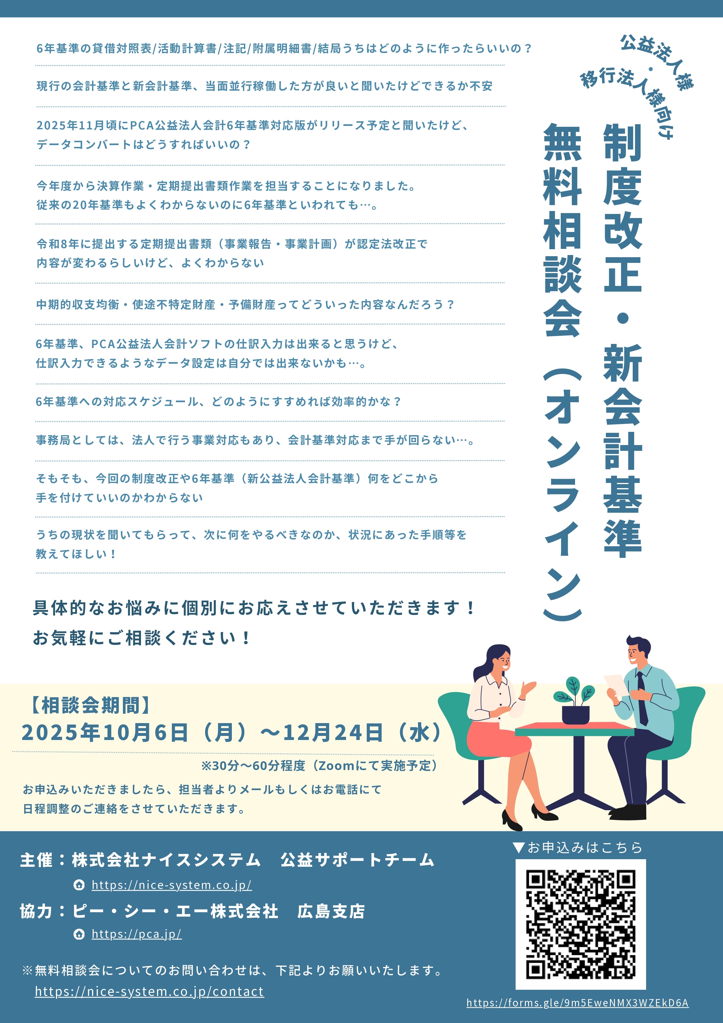 この度、公益法人制度改正に伴い、無料個別相談会(オンライン・Zoom)を開催いたします。令和7年4月には公益法人認定法の改正が施行され、令和10年4月からは新公益法人会計基準(6年基準)の適用が必須となります。ただいまの猶予期間中に「何をどこから手をつければよいか」整理を進めることが重要です。弊社では、法人様ごとに個別に対応いたしますので、具体的な課題に沿ったご提案が可能です。